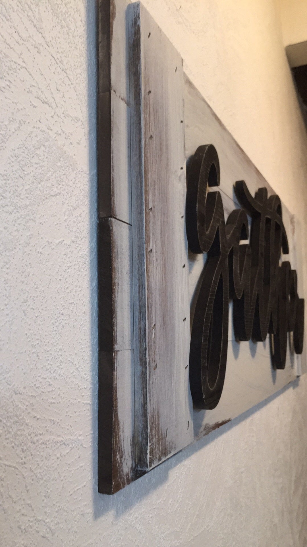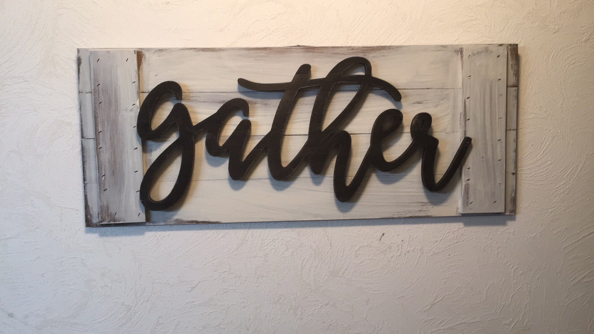 This beautiful gather sign is 12x30. The gather is wood and placed on a poplar wood slats. It has been stained and painted the color you would like